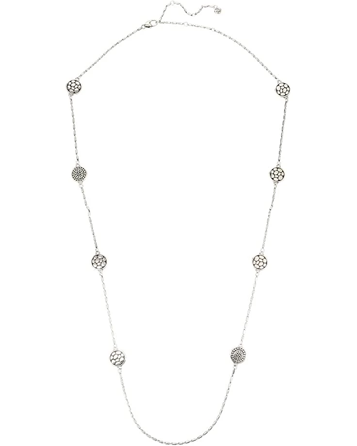 - Sliver-tone plated brass metal necklace with round pebble disc stations.